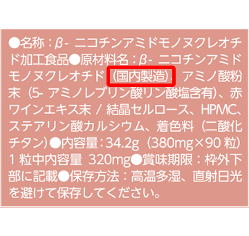 | 原材料名 | β-ニコチンアミドモノヌクレオチド(国内製造)、アミノ酸粉末(5-アミノレブリン酸リン酸塩含有)、赤ワインエキス末/結晶セルロース、HPMC、ステアリン酸カルシウム、着色料(二酸化チタン) |